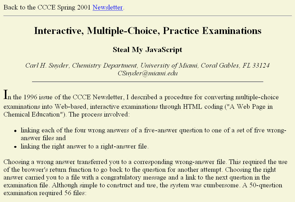 A continuation of web-page development applied JavaScript to simplify the creation of multiple-choice practice examinations. This was published as "Interactive, Multiple-Choice, Practice Examinations -- Steal My JavaScript" in the Spring, 2001, issue of the Newsletter.