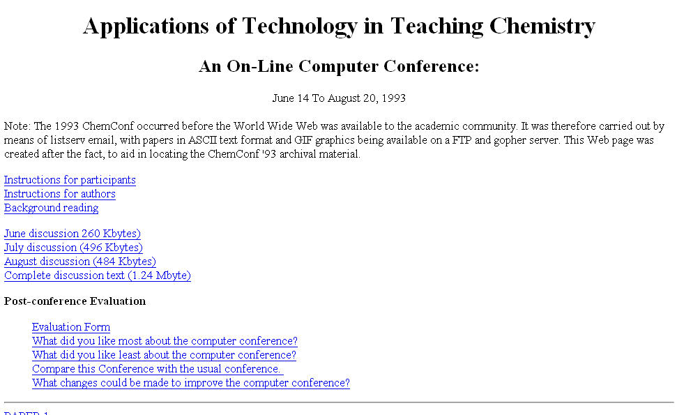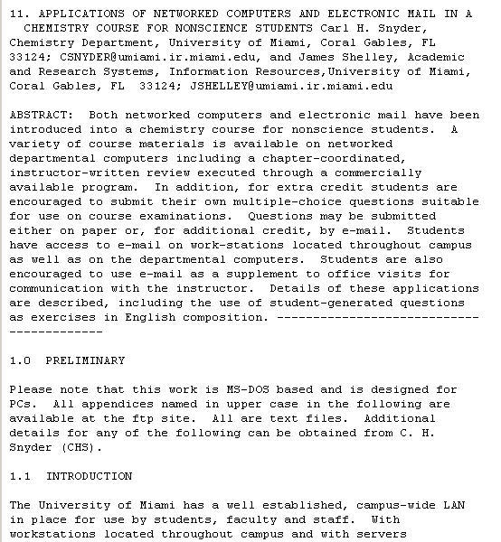 To begin the work Jim Shelley, a colleague in UM's division of Information Resources (now Information Technology), and I set up a networked system that allowed us to introduce electronic mail into a class of chemistry for nonscience students, CHM 101. This resulted in a 1993 ChemConference paper, "Applications of Networked Computers and Electronic Mail in a Chemistry Course for Nonscience Students," still available as Paper 11 at www.wam.umd.edu/~toh/ChemConference/. You'll find all the details there. (ChemConference was the original name of ConfChem.)