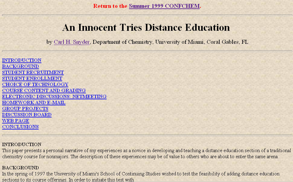 In 1997, with increasing experience, confidence and enthusiasm about computing in chemical education, I became the first in UM's College of Arts & Science to offer a distance education course. (A member of UM's School of Business preceded me by one year. Both courses, mine and the earlier one, were administered by UM's School of Continuing Studies.)